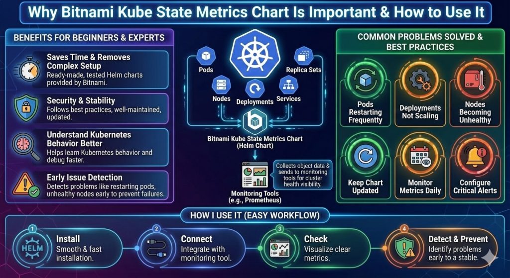 That is when I discovered the Bitnami Kube State Metrics Chart. It helped me understand the real condition of my cluster. It showed me clear metrics in a simple format. I will share my personal experience so even a beginner can understand this easily.